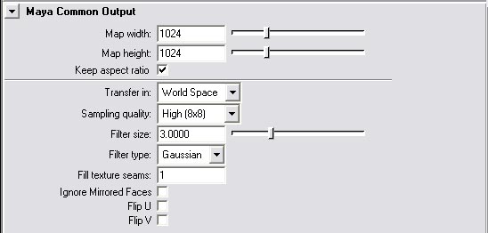 Map width/ height - This attribute sets the width and height in pixels of the texture map. The option to keep the aspect ratio is best left on. The higher the resolution of the map, the more detail we'll be able to transfer. But it will take longer for the transfer map to be created and it will take longer for the transfer map to render.